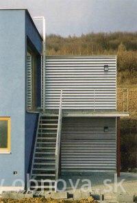 Z herny se přímo vychází na terénní terasu, kterou s horní, zvětšující obytný prostor, spojuje o- celové schodišťové rameno. Zvenku dům poutá pozornost nejen svým tvarem, ale i šedomodrou barvou omítky, která příjemně ladí s dřevěnými rámy oken, i stříbřitými schody stejně jako vlnitým plechem – obkladem vybíhajících stěn propojujících interiér s exteriérem. Zajímavým detailem je posuvný panel z modrého Lexanu stínící v případě potřeby velké okno z obytného prostoru na jižní fasádě. Ten stejný materiál se objevuje ve formě malé markýzy nad vchodem.