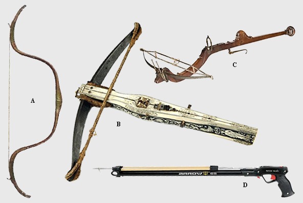 A luk, Turecko(?), cca 1670; B kuša, Nemecko, cca 1590; C balister, Francúzsko,cca 1700 (ang. stonebow, nem. Schnepper), D harpúna ARROW 45, Taliansko, 2011 (ang. Speargun, nem. Harpune)