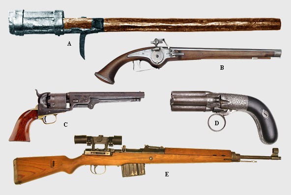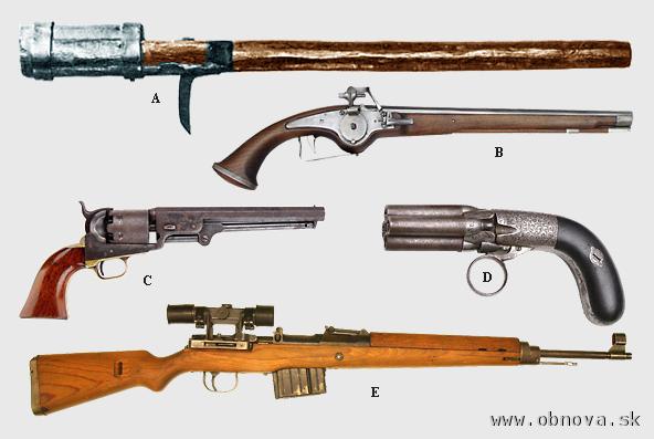 A ručnica, Švajčiarsko, cca 1360; B jazdecká pištoľ, Nemecko, cca 1640; C revolver Colt Navy M 1851, USA, cca 1856 ; D šesťhlavňová pištoľ, Belgicko, cca 1840; E samonabíjacia puška G43, Nemecko, cca 1945
