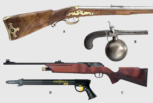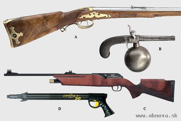 A vzduchovka, Nemecko, cca 1820; B vetrovka, Rakúsko, cca 1800; C plynovka Umarex 850, Nemecko, 2011; D pneumatická harpúna ASSO 30 – vetrovka, Taliansko, 2011