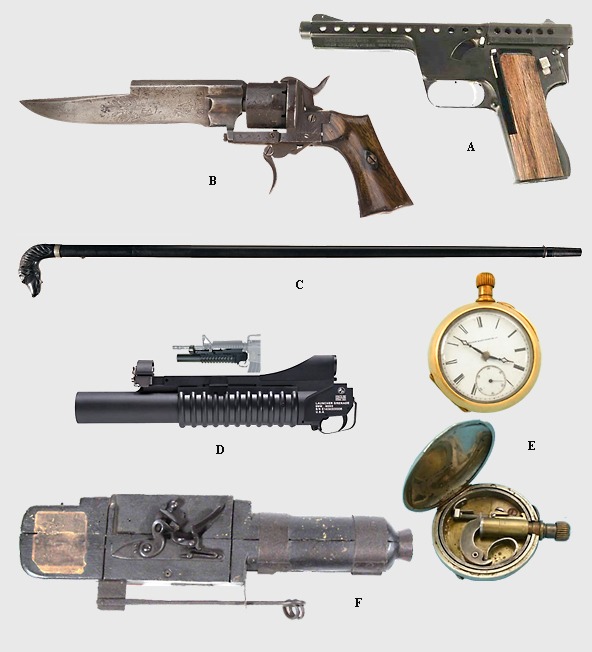 A raketová pištoľ Gyrojet Mark I, kaliber 13mm, USA, cca 1965; B revolver kombinovaný s čepeľou, Belgicko, cca 1860; C puška v palici, USA, cca 1867; D 40 mm závesný granátomet Colt M 203, USA, cca 1970 E strieľajúce vreckové hodinky, kaliber 3 mm, Anglicko, cca 1870; F nástražné strelné zariadenie, Francúzsko, cca 1800
