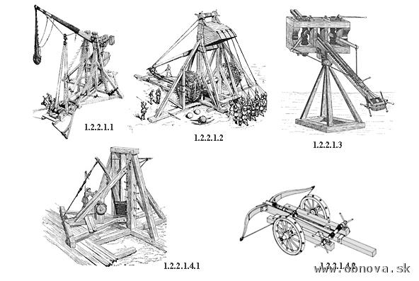 lafetované strelné zbrane, ktoré na vystrelenie strely využívajú mechanickú energiu akumulovanú v hmotnosti závažia alebo pružnom médiu