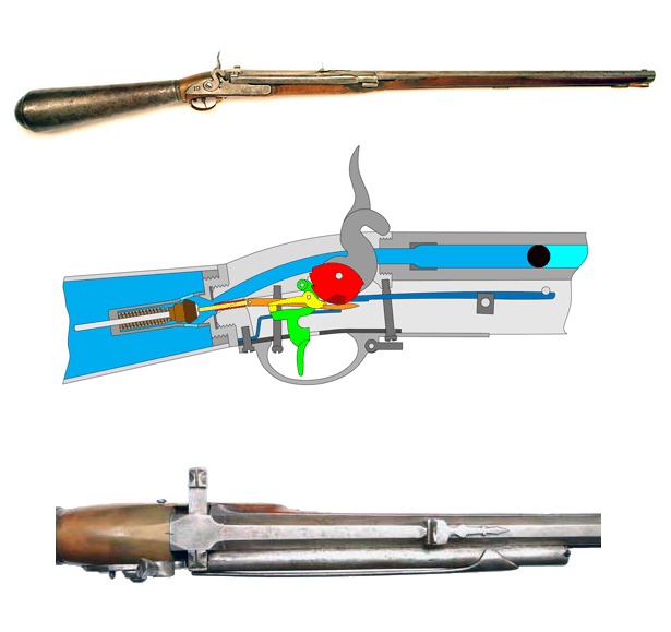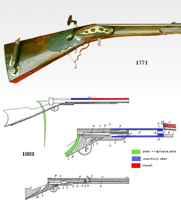 Princípy fungovania Girandoniho vetrovky. Dole pohľad zhora,viditeľný zásobník