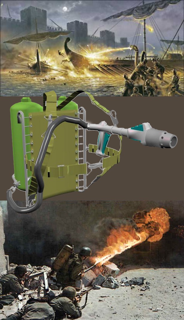 Počiatky ohňometov možno nájsť v bizantskom gréckom ohni, ktorý bol označovaný aj ako „morský oheň“ alebo „rímsky oheň“ a objavujú sa najmä vo výzbroji vojnových lodí. Bol vynájdený okolo roku 627 a do ohňometných dýz ho hnal stlačený vzduch (6). Po prestávke, ktorá trvala niekoľko storočí, sa ohňomet vracia do výzbroje ozbrojených zborov a horľavú kvapalinu ženie opäť stlačený vzduch, oxid uhličitý, dusík alebo bután. Toho, kto to dočítal až sem snáď nemusím presviedčať, že ohňomety sa radia do skupiny plynových zbraní a podľa hnacieho média do podskupiny vetrovky a plynovky (7).