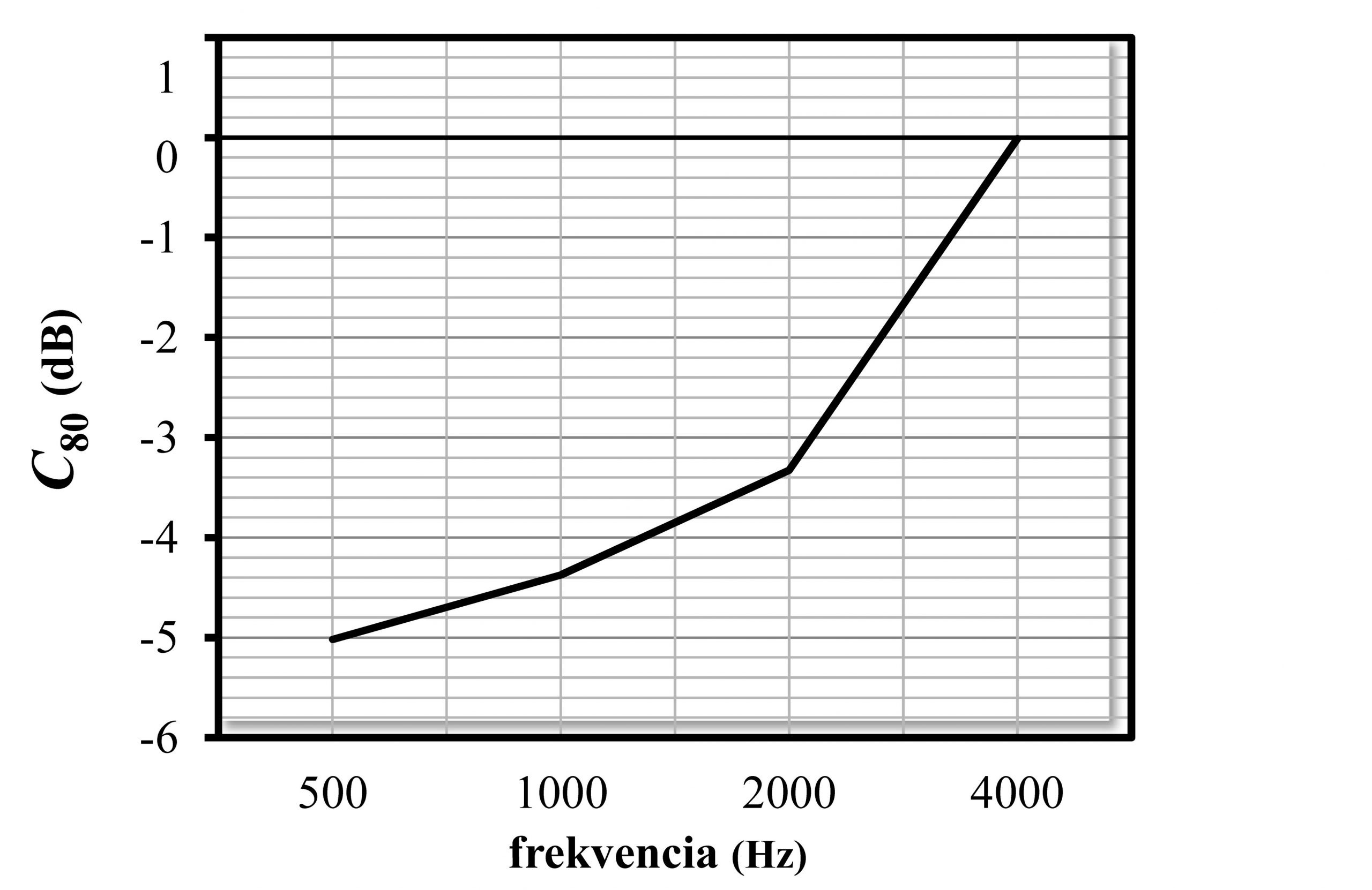 Dôležitým parametrom z pohľadu jasnosti a zrozumiteľnosti hudby v priestore je pomer počiatočnej a neskoršie prichádzajúcej zvukovej energie C80. Hodnoty namerané v Synagóge v Liptovskom Mikuláši (Graf 5, Tabuľka 5) spadajú podľa aktuálnej kategorizácie (Vondrášek a Antek, 2005, s. 10) do pásma priestorov vhodných na interpretáciu hudby v pomalších tempách s preferenciou dychových nástrojov, organu a spevu. V prietore príliš nevyznejú rýchle tempá v interpretácií hudobných nástrojov perkusívneho charakteru (klavír, bicie nástroje).