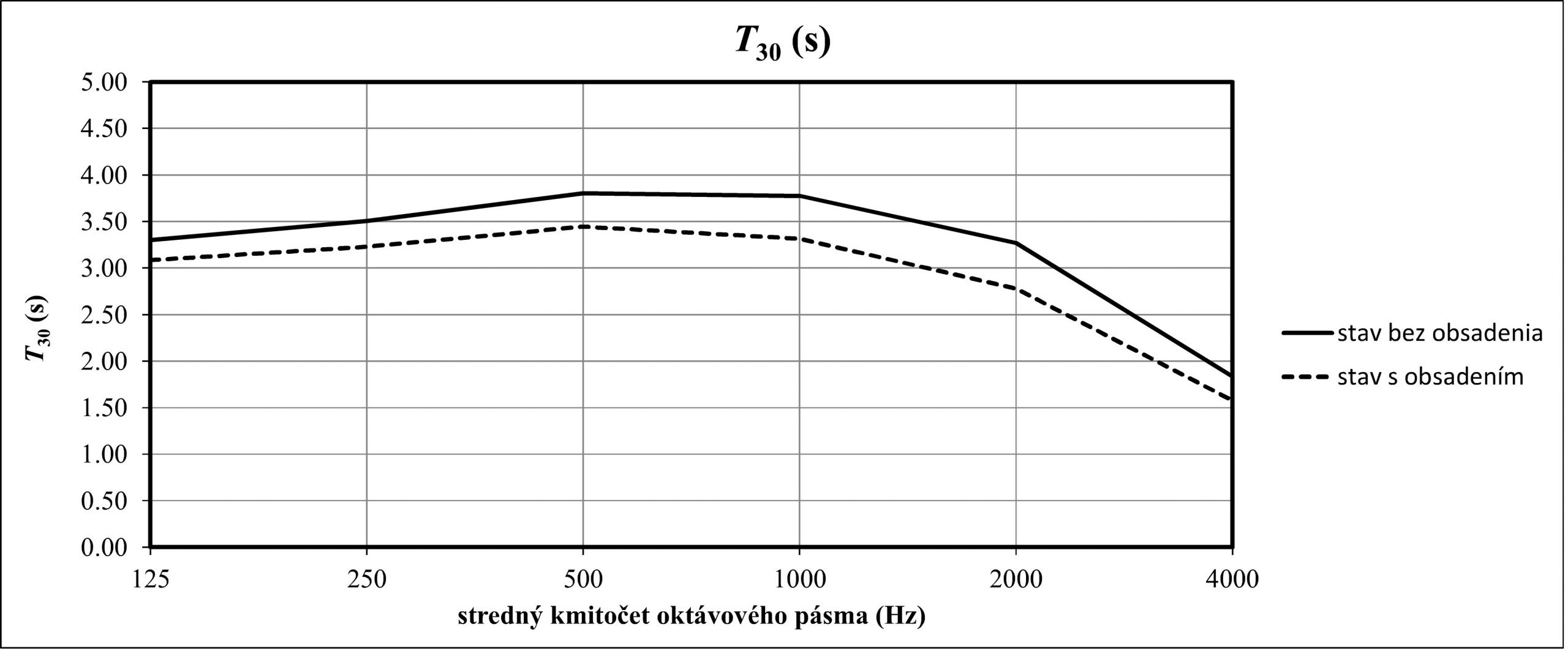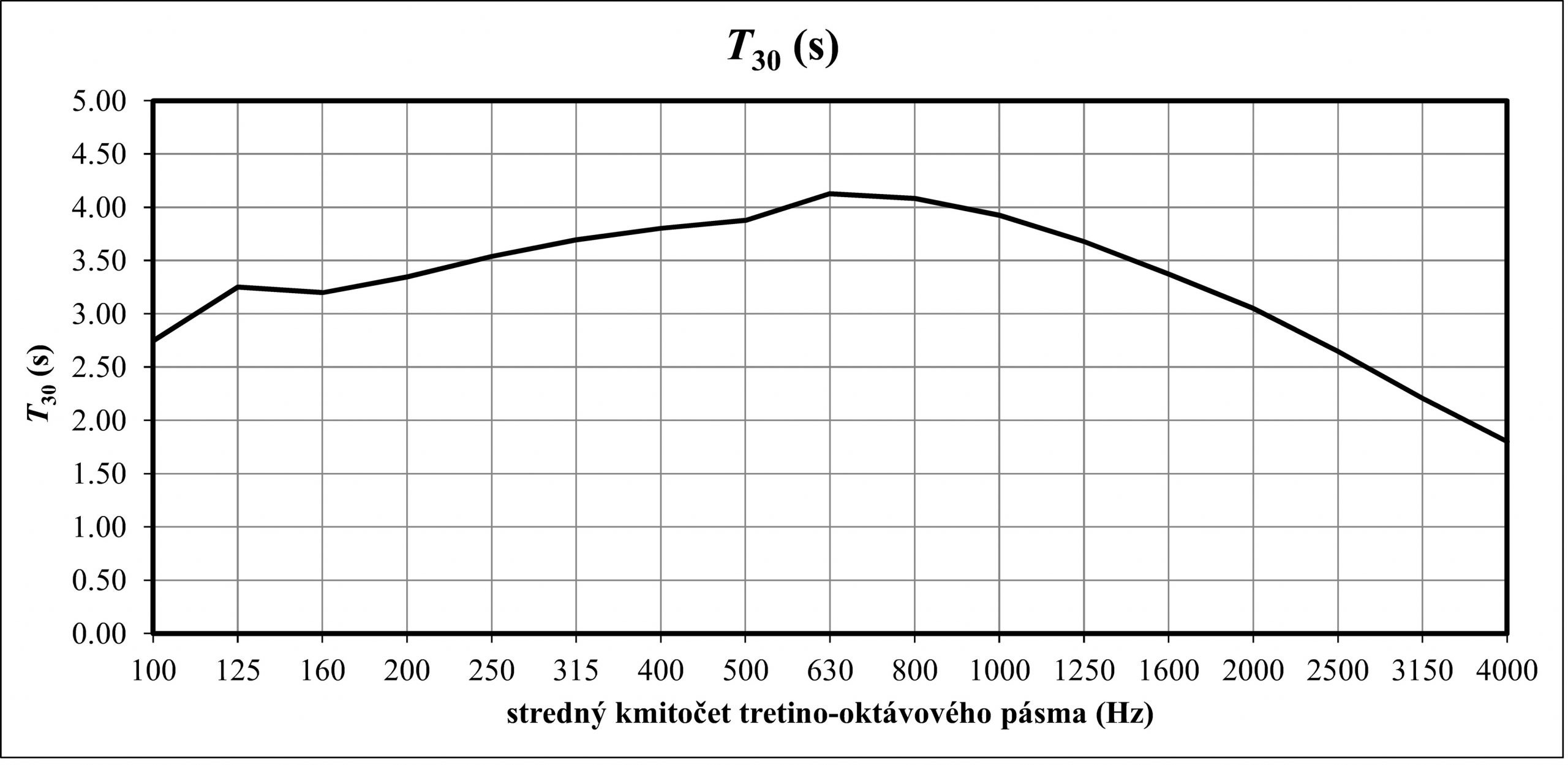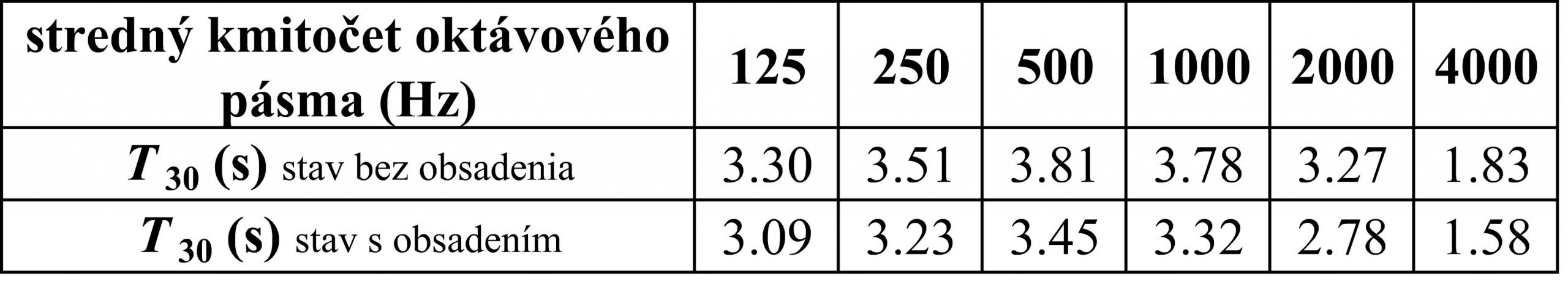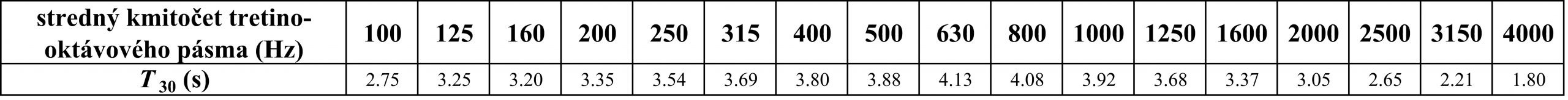 Tabuľka 1 Číselné vyjadrenie času dozvuku T30 (s) v tretino-oktávovom frekvenčnom pásme