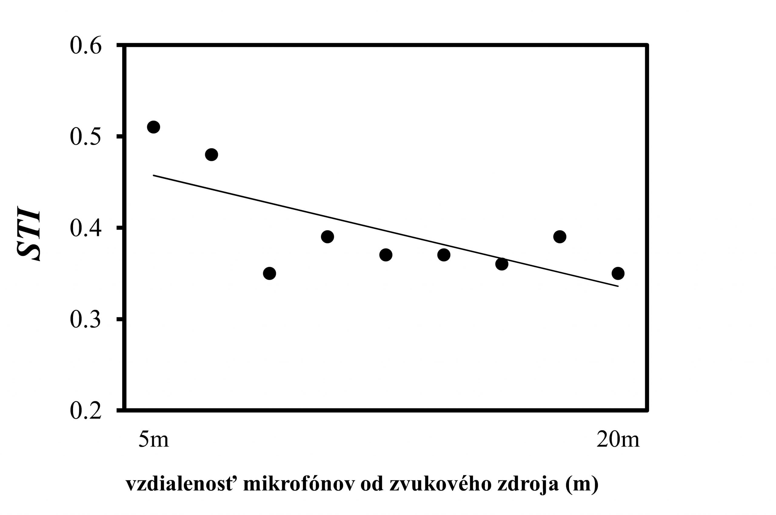 Graf 6 Index prenosu reči STI vyjadrený pre každú meranú pozíciu a jej vzdialenosť od zdroja zvuku Z1.