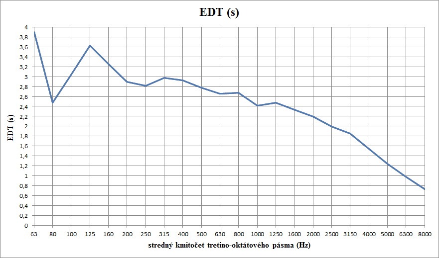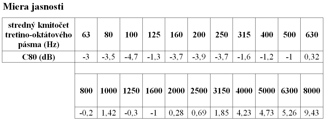 Teoretický výstup výskumu mal za úlohu zistiť základné akustické charakteristiky priestoru, ktoré bolo možné získať v našich meracích podmienkach. Hlavnou úlohou takto spracovaných výsledkov výskumu je možnosť vytvoriť si zvukovú predstavu o danom akustickom priestore, čo môže dobre poslúžiť napríklad hudobným telesám a koncertným majstrom pre výber vhodného priestoru. Získané údaje sme spracovali podľa metodológie normy STN EN ISO 3382 a uvádzame ich v nasledujúcich tabuľkách.
