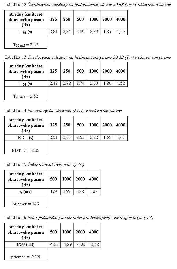 Výstupmi výskumu sú nasledovné parametre podľa normy STN EN ISO 3382: