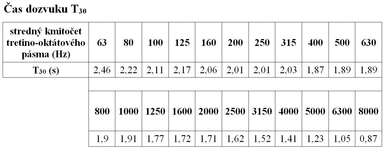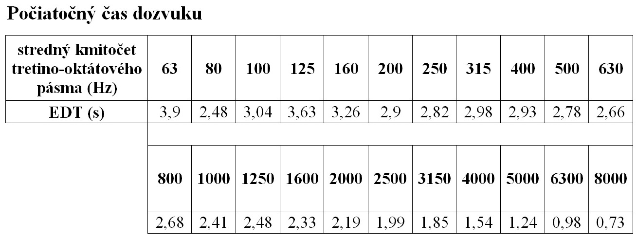 Teoretický výstup výskumu mal za úlohu zistiť základné akustické charakteristiky priestoru, ktoré bolo možné získať v našich meracích podmienkach. Hlavnou úlohou takto spracovaných výsledkov výskumu je možnosť vytvoriť si zvukovú predstavu o danom akustickom priestore, čo môže dobre poslúžiť napríklad hudobným telesám a koncertným majstrom pre výber vhodného priestoru. Získané údaje sme spracovali podľa metodológie normy STN EN ISO 3382 a uvádzame ich v nasledujúcich tabuľkách.