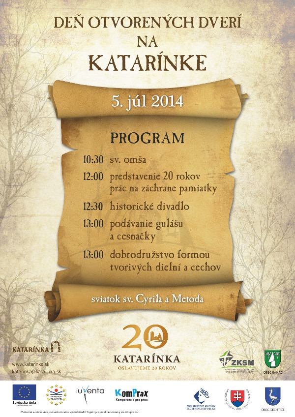 Deň otvorených dverí na Katarínke sa uskutoční aj tento rok na sviatok sv. Cyrila a Metoda. V sobotu 5. júla privítajú dobrovoľníci z projektu Katarínka a obce Naháč návštevníkov, ktorí chodia nielen z okolitých obcí a blízkeho okolia, ale aj zo vzdialenejších krajov. Prichádzať k nám môžu turisti po turistických značkách z Naháča aj vzdialenejších Dechtíc, ako aj z parkoviska pod Katarínkou, na ktoré sa dá dostať cez odbočku na ceste medzi spomenutými obcami.