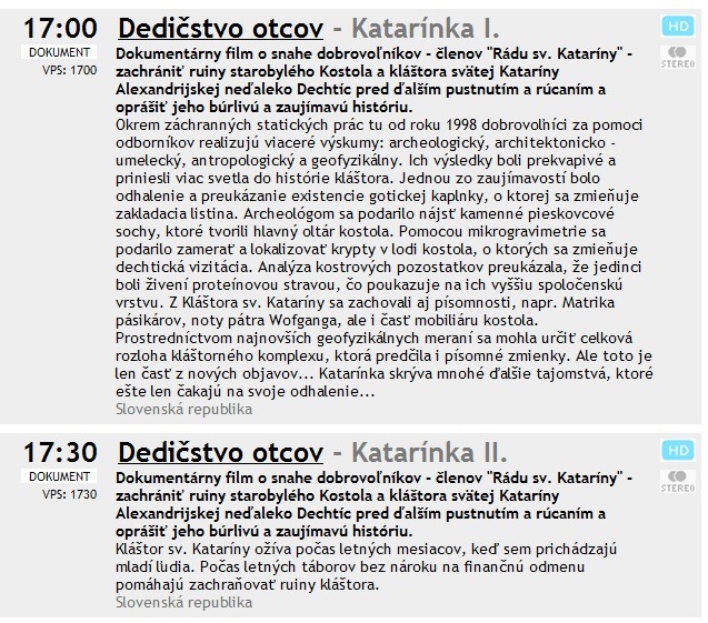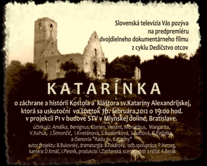Na Veľkonočnú nedeľu popoludní a Veľkonočný pondelok ráno (repríza) bude v STV premiéra dvojdielneho Dokumentu o Katarínke v rámci cyklu Dedičstvo otcov.