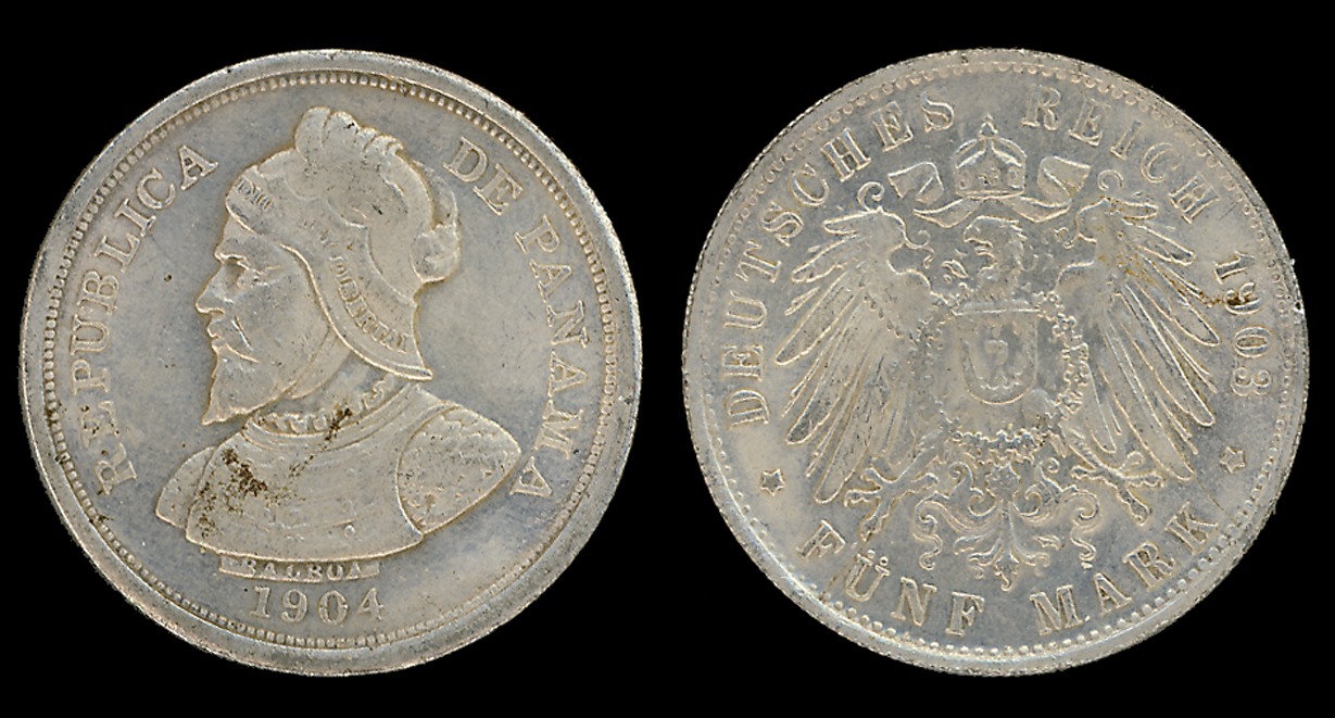 Možno medzi nimi nájsť aj pikošky. Napríklad artefakt, ktorého averznú stranu tvorí reliéf panamských 50 centésimov a reverz reliéf nemeckých 5 mariek.