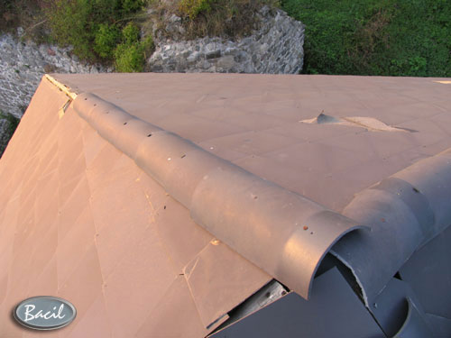 Vetrom poškodené nárožie sme opraviť nedokázali, pretože napriek 9m dlhému rebríku sme sa k nemu nedostali a po krytine sa chodiť nedá, lebo je krehká. Tak bude do nárožia zatekať.