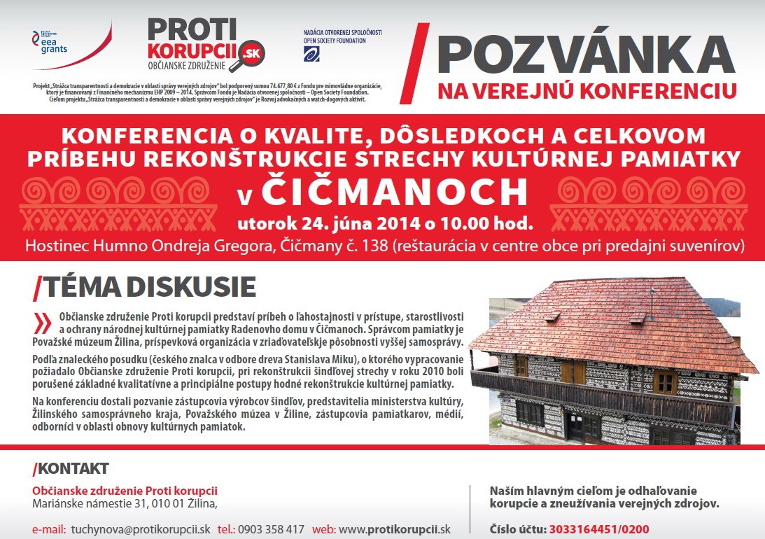 Obcianske združenie Proti korupcii predstaví príbeh o lahostajnosti vprístupe, starostlivosti a ochrany národnej kultúrnej pamiatky Radenovho domu v Cicmanoch. Správcom pamiatky je Považské múzeum Žilina, príspevková organizácia v zriadovatelskje pôsobnosti vyššej samosprávy. Podla znaleckého posudku (ceského znalca vodbore dreva Stanislava Miku), oktorého vypracovanie požiadalo Obcianske združenie Proti korupcii, pri rekonštrukcii šindlovej strechy vroku 2010 boli porušené základné kvalitatívne aprincipiálne postupy hodné rekonštrukcie kultúrnej pamiatky. Nakonferenciu dostali pozvanie zástupcovia výrobcov šindlov, predstavitelia ministerstva kultúry, Žilinského samosprávneho kraja, Považského múzea v Žiline, zástupcovia pamiatkarov, médií, odborníci voblasti obnovy kultúrnych pamiatok.
