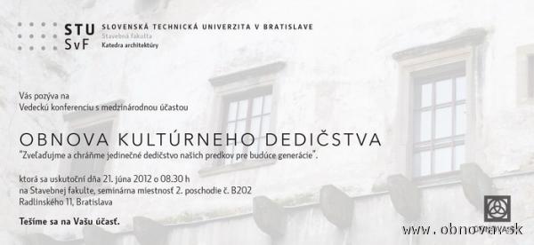 Katedra architektúry STU Svf Vás pozýva na Vedeckú konferenciu s medzinárodnou účasťou: OBNOVA KULTÚRNEHO DEDIČSTVA “Zveľaďujme a chráňme jedinečné dedičstvo našich predkov pre budúce generácie”, ktorá sa uskutoční dňa 21. júna 2012 o 08.30 hod na Stavebnej fakulte, seminárna miestnosť 2. poschodie č. B202, Radlinského 11, Bratislava