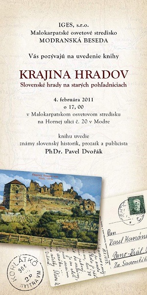 IGES, s.r.o, Malokarpatské osvetové stredisko, Modranská beseda, Vás pozývajú na uvedenie knihy, ktoré sa uskutoční 4. februára 2011 o 17:00 v Malokarpatskom osvetovom stredisku na Hornej ulici 20 v Modre. Knihu uvedie známy slovenský historik, prozaik a publicista PhDr. Pavel Dvořák.