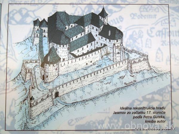 Ideálna rekonštrukcia hradu Jasenov zo začiatku 17. storočia podľa Petra Guteka, kresba autor