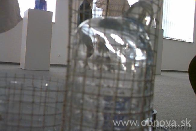 Fotografie z vystavy Sklari. Vystava bola zlozena z prac sklarov z celeho sveta, ktori na workshope v Lednickych rovniach vytvorili svoje diela. Vystava bola instalovana na jar 2001 v zhorenisku.
