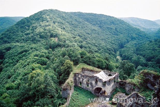 Pohľad na II. vstupnú bránu na jar roku 2002 na začiatku rekonštrukcie – vidno ešte provizórnu igelitovú strechu