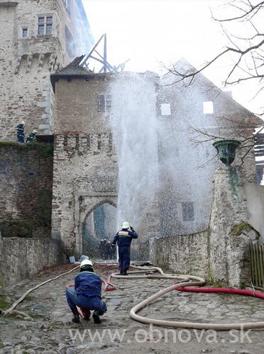 Hasiči boli na mieste asi o 8-10 minút od ohlásenia, pričom podľa zákona je dojazdový čas až 20 minút. Postupne tam zasahovalo až 20 hasičských jednotiek. Zásah bol komplikovaný najmä tým, že na hrade nie sú dostatočne výdatné zdroje vody a preto bolo potrebné zriadiť dve čerpacie stanovištia v obci Nedvědice a odtiaľ kyvadlovú dopravu vody pomocou cisterien. Zásah hasičov sťažovala aj poloha horiacej budovy v centrálnej časti hradu, na treťom nádvorí. Hasičské cisterny sa dostali len na prvé nádvorie. Odtiaľ museli až na miesto nešťastia natiahnuť hadice.