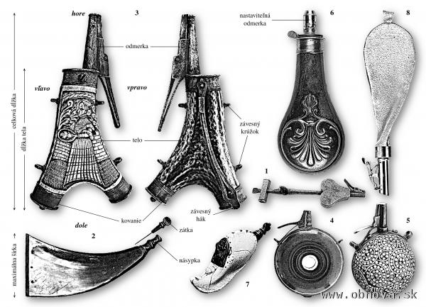 Zvláštnym, často s prachovnicou zamieňaným náradím je zásobník na broky (8), ktorý sa od nej líši materiálom, z ktorého je vyrobený (v prevládajúcej miere koža) a konštrukciou dávkovacieho mechanizmu. Tiež spôsob nosenia bol odlišný. Na rozdiel od prachovnice sa zásobník na broky nosil ústím násypky dolu.
