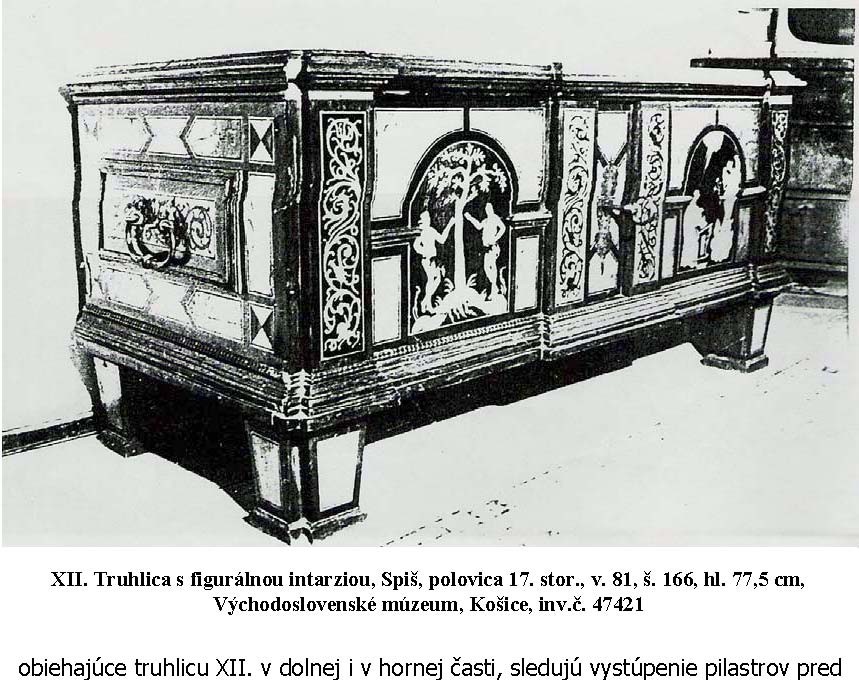 zriedkavejšie členenie na dve polia ohraničené štyrmi pilastrami, medzi ktorými je umiestnená len úzka vpadnutá lišta s geometrickou výzdobou a s ozdobným tepaným kovaním zámku s kľúčom. Tento typ členenia čelnej dosky uplatňuje spomedzi nám známych truhlíc aj spišská truhlica XXIII. z múzea v Markušovciach zo záveru 17. storočia, truhlica XX. z Levoče, datovaná okolo roku 1700, truhlica XV. pravdepodobne rovnako spišskej proveniencie z konca 17. storočia, neskororenesančná práca s prvkami baroka, truhlica XVII. z Huncoviec, z roku 1692. Zdá sa, že ide o výstavbu typickú pre neskoré práce záveru 17. storočia. Intarzia vytvorená z rôznofarebných dýh utvára na pilastroch motívy rozvilín známe zo spišských prác, blízke najmä truhliciam IV. a V. z prvej polovice 17. storočia. Rovnakým spôsobom je poňaté aj rámovanie oblúkov v oboch vpadnutých poliach s figurálnou výzdobou. Rozvilinové motívy sa uplatnili aj na kazetách bočných stien s kovaniami, ktoré rámujú geometrické intarzie s motívom diamantov. Tieto rovnako pripomínajú levočskú tvorbu a to konkrétne výzdobu skrine z Východoslovenského múzea v Košiciach (obr. 12) z polovice 17. storočia52. Bohato profilované rímsy