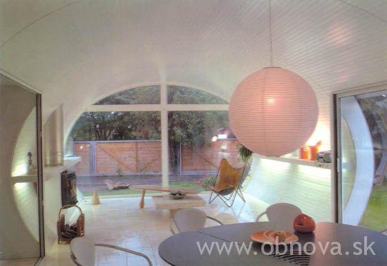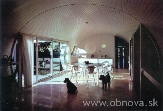 Od vstupní branky vnímáme zasklenou čelní stěnu v tvaru elipsy, orámo- vanou obvodovou skořápkou, ukončenou konstrukcí kšiltu. Návštěvník nabývá dojmu, že dům se mu otevírá a přátelsky ho vítá. Bílý vnitřní pros- tor vyzařuje příjemnou atmosféru, celkový účinek je okouzlující. Vnitřní i vnější prostory se navzájem harmonicky prolínají. Doplňkové prostory jsou oddělené posuvnými transparentními stěnami, čímž vzniká jakási vzdálená příbuznost s japonským domem. Tak jako si při lehkém plynutí krásného zpěvu neuvědomujeme náročnou přípravu zpěvačky, ani při vnímaní harmonie tohoto domu nezpozorujeme napoprvé všechny podro- bnosti důmyslné dispozice, konstrukce a detailů. Osobitost domu si vyžaduje uvést alespoň základní stavební charakteristiku.