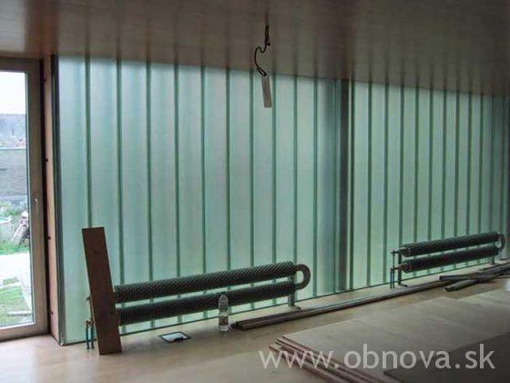 Transparentní kvádr experimentálního domu s volitelnými dispozicemi leží ve stopě obvyklé pro původní místní zástavbu. Fasádní systém vyvinutý pro průmyslové zaskle- ní obaluje montovanou ocelovou konstrukci. Dvanáct ocelových sloupů založených na železobetonové vaně zapuštěné ve svažitém terénu nese rámy železobeto- nových desek pater. Skleněné tvárnice skládají kolem ocelových sloupů dvojplášt s provětrávanou vzduchovou mezerou. Otevíravé klapky v jeho dolní a horní části re- gulují průtok vzduchu fásádou v závislostí na změnách venkovní teploty. V zimě plášt působí jako tepelný kole- ktor vytápěný světelnými paprsky. V létě je ochlazován proudícím vzduchem nasávaným pod pochůzími rošty anglického dvorku. Tepelný příkon obvodového pláště zajištuje cca 40% energie potřebné k vytápění domu.