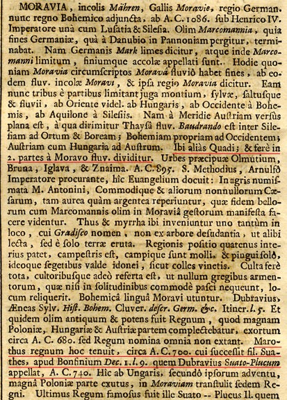 Johann Jacob Hofmann nám pri termíne MORAVIA prináša aj iné zaujímavé informácie, ktorým sa ale budeme venovať až v samostatnej rozprave o časoch Svätoplukových. Pre nás je však teraz najpodstatnejšia správa o umiestnení Kvádov, ktorú nám Lexicon Universale prináša: