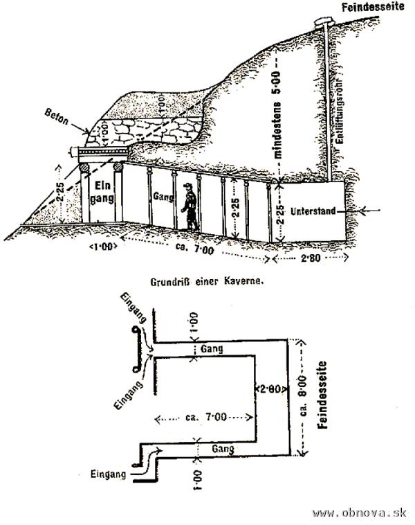 – voj. v rakúsko-uhorskej vojenskej terminológii objekt poľného opevnenia, skalný úkryt (8 x 2,8 x 2,25 m) odolný proti priamemu zásahu granátu pre 48 mužov.