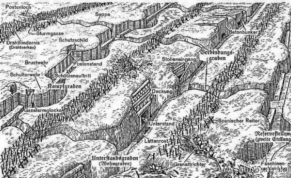 Vorschriften für den Stellungskrieg aller Waffen. Stellungsbau. zv. 1, Berlin, 1916, 90 s.