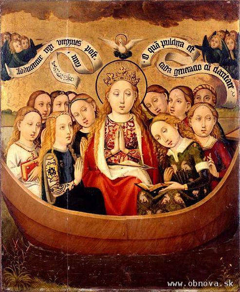 Ďalšie atribúty: korunka na hlave, panny ukryté pod plášťom, koruhva s krížom, palmový list, lampa.