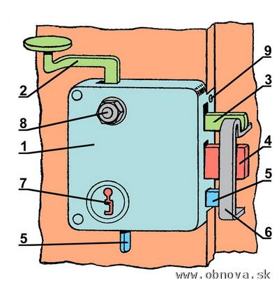 1 skriňa, 2 kľučka, 3 západka kľučky, 4 závora, 5 zástrčka, 6 zapadací hák, 7 kľúčový otvor, 8 skrutka kľučky s maticou, 9 montážny vrut alebo klinec