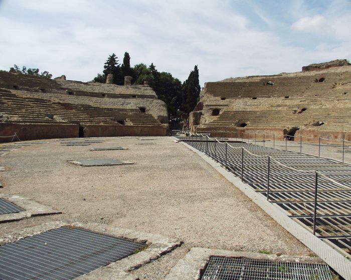 Vo vnútri je amfiteáter nádherný. Všade naokolo sú zachovalé kamenné rady sedadiel. V ?ase najvä?šieho rozkvetu mohlo ob?úbené hry naraz sledova? až 35-40 000 ?udí. To už je ?o poveda?.
