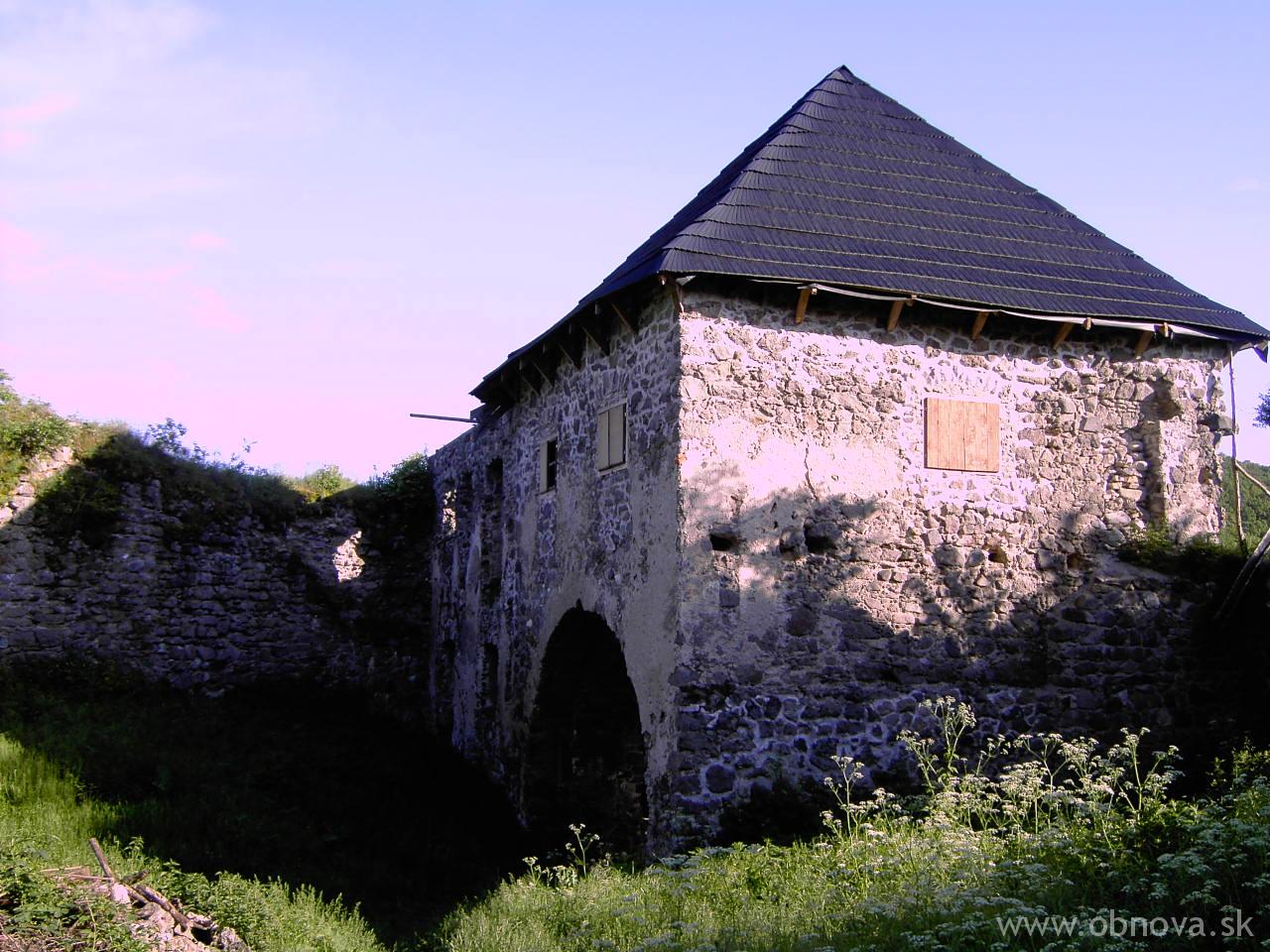 Pohľad na II. vstupnú bránu na jar roku 2002 na začiatku rekonštrukcie - vidno ešte provizórnu igelitovú…
