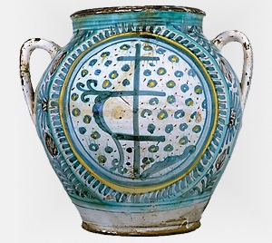 Lekárenská keramická nádoba hrncovitého tvaru s párovými uchami. Taliansko, 17. storočie.