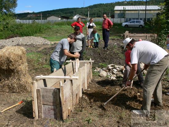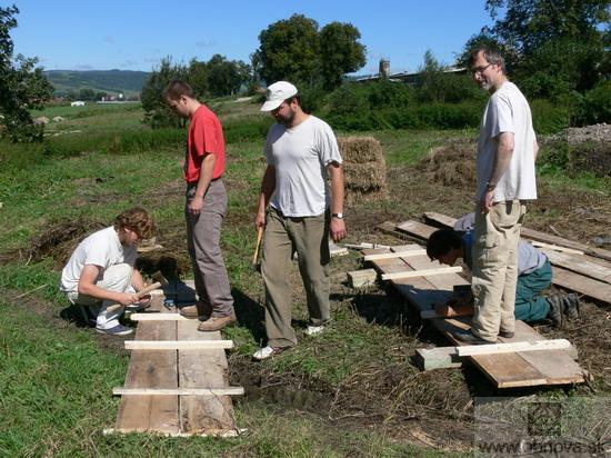 Prace sa realizovali za mestom smerom na spisske vlachy. Tu by mali vyrast dva nizkonakladove domy pre chodobnych. V tomto pripade romakov. My sme si pocas workshopu vyskusali dva typy stavby domu. Hlineny dom nabijany do drevenej posuvnej konstrukcie a ciastocne dom zo slamennych balikov s lieskovym vypletom a omazanymi hlinenou omietkou. Na fotografii vyroba salungu/debnenia.