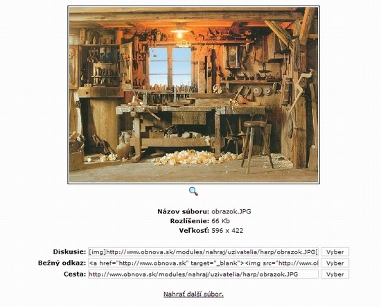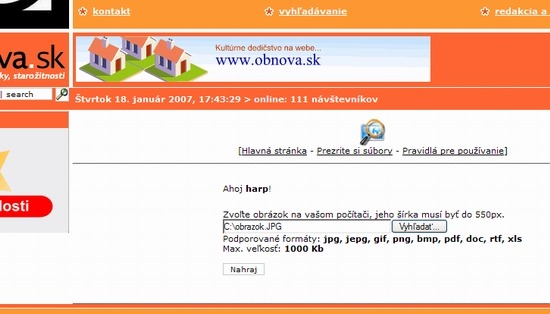 Na vasom pocitaci najdete tlacidlom „Vyhladat“ fotografiu ktoru chcete vlozit do Obnova.sk. Nezabudnite ze by mala mat sirku do 550pixelov. Stlacte tlacidlo „nahraj“. Otvori sa vam nasledujuce okno…