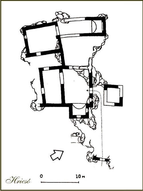 Ideová rekonštrukcia hradu ( zdroj : http://www.varak.hu/ )Do horného hradu sa vstupovalo bránou vysekanou do skaly, z ktorej vysekali aj lavice pre stráže. S veľkou námahou vystavané obytné budovy vytvorili jednoliaty celok so skalným masívom. Zo súvislej hmoty horného hradu vystupovala iba veža pred vstupom a na západnej strane časť paláca. V polovici 16. storočia, keď po moháčskej bitke oslabila štátna moc, hrad prechodne vlastnili aj lúpežní rytieri. Ku koncu 17. storočia je už Hričov na svoju dobu málo pohodlný, a preto opustený začína sa čas jeho rozpadu.