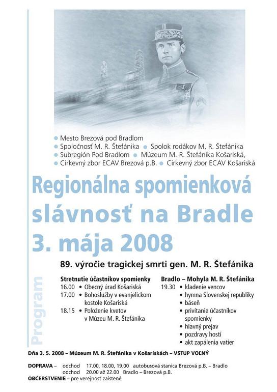 Program slávností otvorí bohoslužba v evanjelickom kostole v Košariskách. Z chrámu sa sprievod presunie k múzeu M. R. Štefánika, kde sa k Štefánikovej soche slávnostne položia vence. V Štefánikovom rodnom dome privíta účastníkov slávnostnej spomienky riaditeľ múzea Rastislav Púdelka. Slávnosť bude pokračovať pri Mohyle na Bradle a vyvrcholí zapálením vatier na Bradle o 19:30.