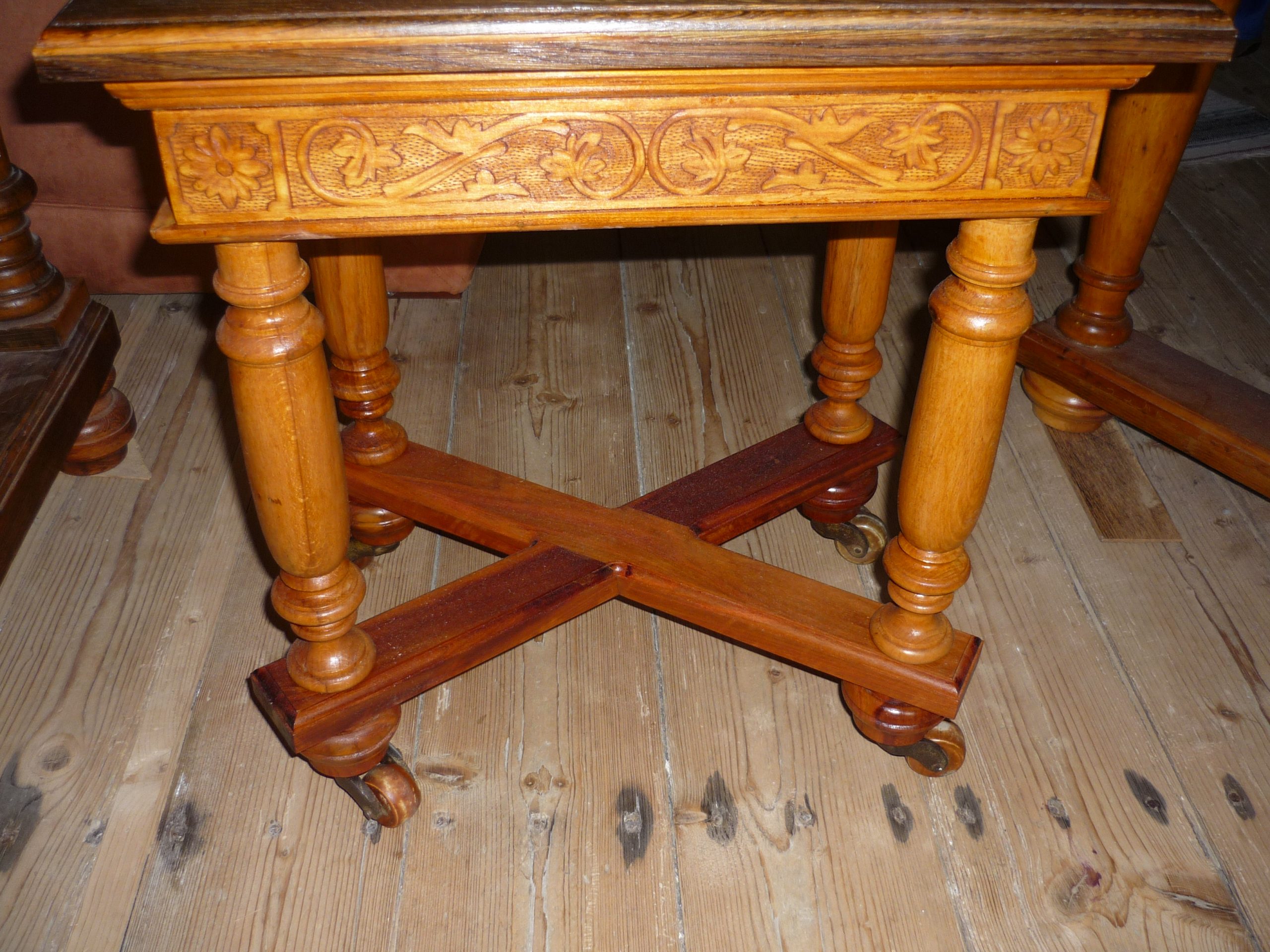 Kolieska sú primontované k truhle natrvalo a sú zrejme staršieho dáta, lebo nie sú otáčacie, keby ich vtedy poznali, tak tam sú, tak ako napríklad na tomto servírovacom stolíku.