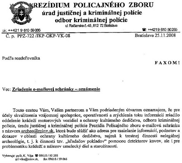 Oznámenie Prezídia Policajného zboru – Úradu justičnej a kriminálnej polície, Odboru kriminálnej polície o zriadení osobitnej e-mailovej schránky zameranej najmä na operatívne oznamovanie a sústreďovanie informácií a udalostí spojených s problematikou archeologických nálezov, nálezísk a s kriminalitou, ktorá s touto oblasťou súvisí.