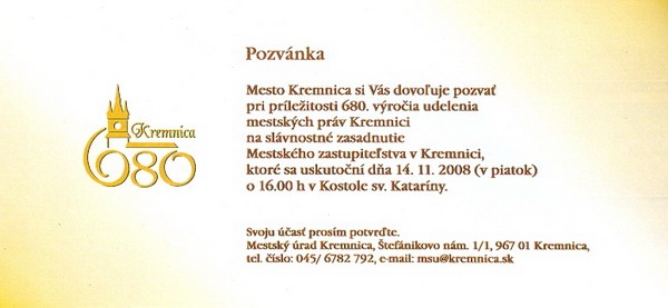 dovolujem si Vas pozvat na krst mojej knizky Kremnica – mesto pribehov (Kapitoly z dejin mesta v 18. storoci), krst bude sucastou slavnostneho Mestskeho zastupitelstva v Kremnici, ktore bude venovane 680. vyrociu zalozenia mesta Kremnice, a ktore sa uskutocni 14. 11. (piatok) o 16.00 hod. v Kostole sv. Katariny na Mestskom hrade v Kremnici, a to za ucasti prezidenta SR, krstnym otcom knizky je historik Pavel Dvorak, s uctou z Kremnice