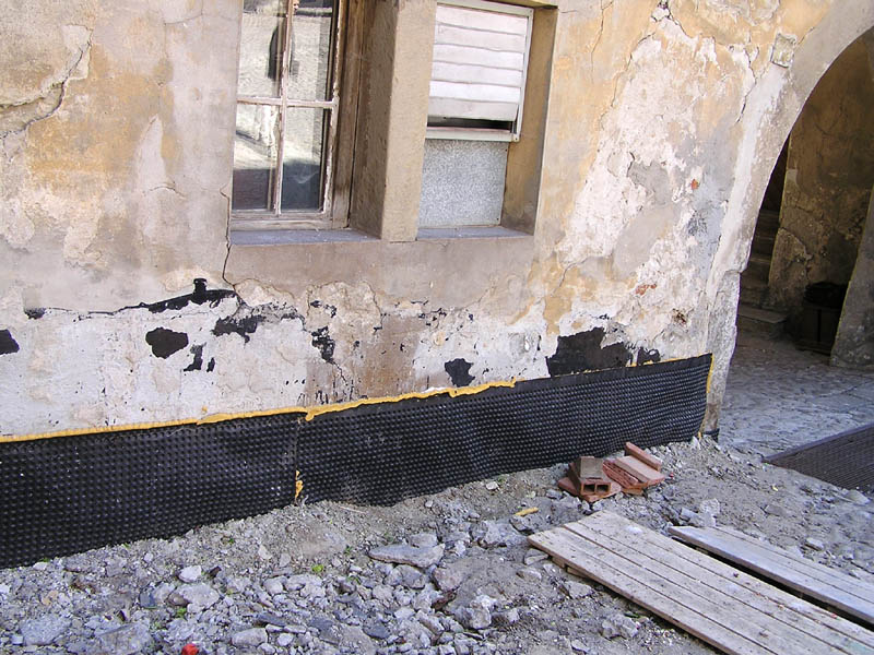 Tu je pouzita nopova folia zrejme s umyslom ochranit murivo pred vlhkostou.
