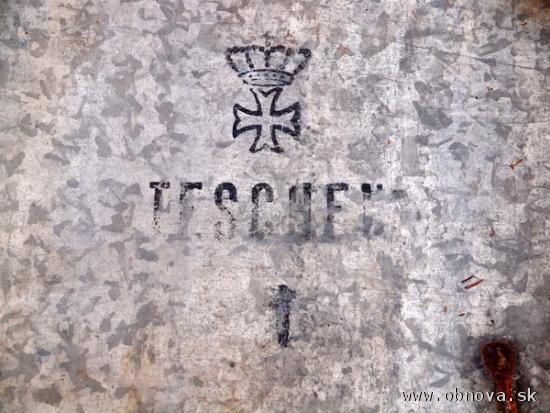 Zdravím. Na našom dome meníme strešnú krytinu. Predchádzajúci falcovaný plech nechal klásť pradedo vraj v 30-tych rokoch (prekryl staršie drevené šindle), presnejšie neviem. Plech má na spodnej strane značku „TESCHEN“ a znak (cisárskej?) koruny a maltézskeho kríža.