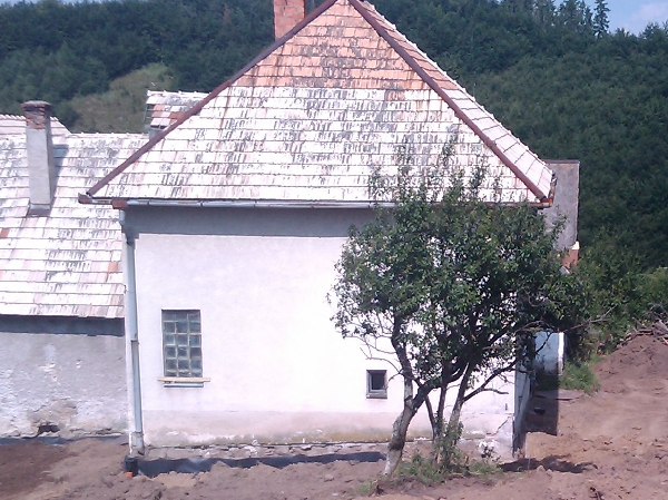 Moja otazka je – zaklady sa robia do nemrznucej hlbky. Ak su vsak zaklady robene zo skal bez akehokolvek pojiva, len skaly ukladane na sebe – vadi im mraz? Pokial sa taketo zaklady odkryju z dosledku uprav terenu – dom v kopci – a zisti sa, ze nakolko bola cast domu v kopci zaklady boli robene len do hlbky 30cm, tak sme v podstate odkryli zaklady, ktore boli predtym chranene zemou. A otazka znie, co teraz? Momentalne je tam ponechana rovina, nop folia a drenazka – izba v kopci totizto velmi vlhla, kedysi pouzivana ako pivnica, vid male okienko. Zboku su ale dalsie okna. Nasim cielom to bolo vyrovnat a otvorit, nakolko je to slnecne strana, juh, vychod.