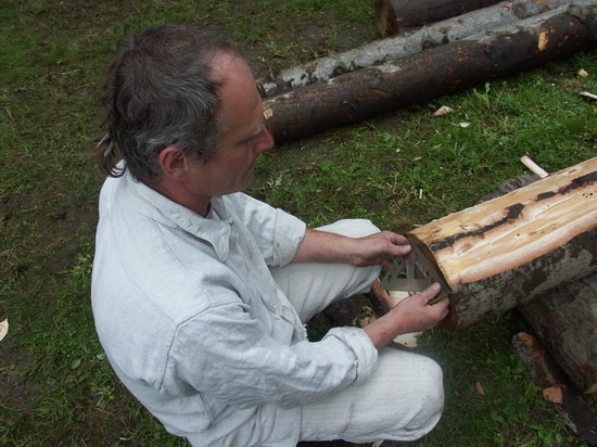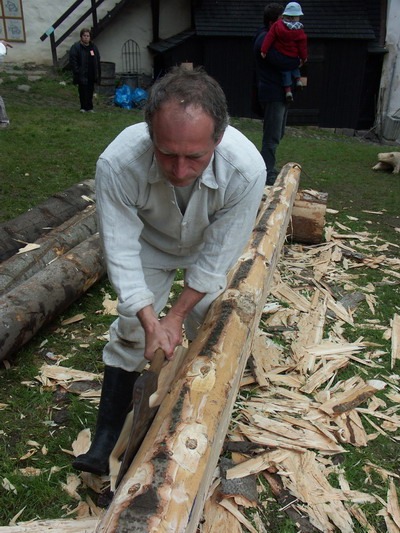 Takze sa ani necudujem, ze to len tak lizli teslou alias toporom, original sa hruba trieska berie normalnou sekerou a az potom tenka trieska toporom, to sa vsak musi opracovavat riadny klat, z ktoreho bude riadny hranol, pricom ten co seka hrubu triesku cuva a ten co robi toporom ide za nim uz normalne dopredu. To vsetko vsak Julo a Boris stopercentne vedia. Vsak Boris a ja mame rovnakych ucitelov…