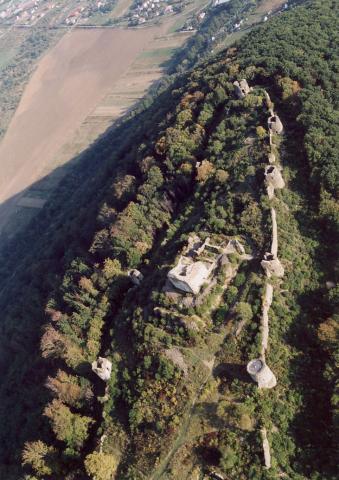 Hrad na sopečnom zalesnenom kopci vo výške 570mnm.