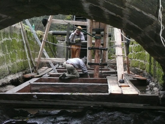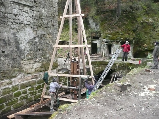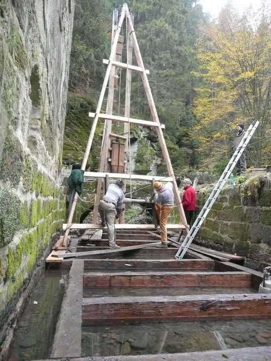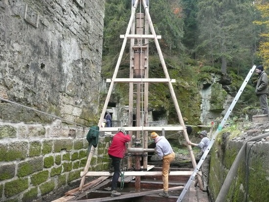 v pátek 6. listopadu v podvečer byla zprovozněna replika středověkého berana, určeného k zatloukání pilot. Autorem dřevěného troje je p. Petr Růžička. Stroj je určen k zakotvení roštu v náhonu (kvůli dláždění dna). První pokusná pilota byla zatlučena tímto strojem až do hloubky 2,3 m. Výkonnost je cca 2 piloty za den (nutno počítat i čas na přesouvání zařízení). Celkem bude zatlučeno 10 kusů pilot (stav k dnešnímu dni: 3 piloty). Předpokládané ukončení akce je koncem týdne. Udělejte si čas – a zajeďte se na tuto evropskou premiéru podívat.
